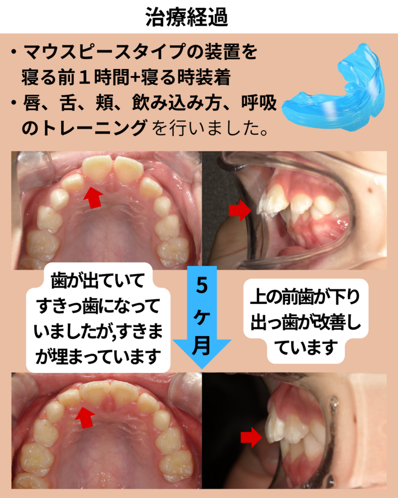 マウスピース装着(寝る前1時間+就寝中)+唇・舌・頬・呼吸のトレーニングで、5ヶ月後に出っ歯・すきっ歯ともに改善。