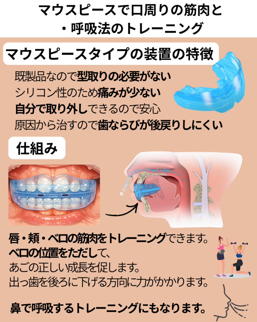 装置は唇・頬・舌の筋肉をトレーニングし、舌の位置を正すことであごの正しい成長を促します。また、鼻で呼吸するトレーニングにもなるため、出っ歯の根本原因にアプローチできます。