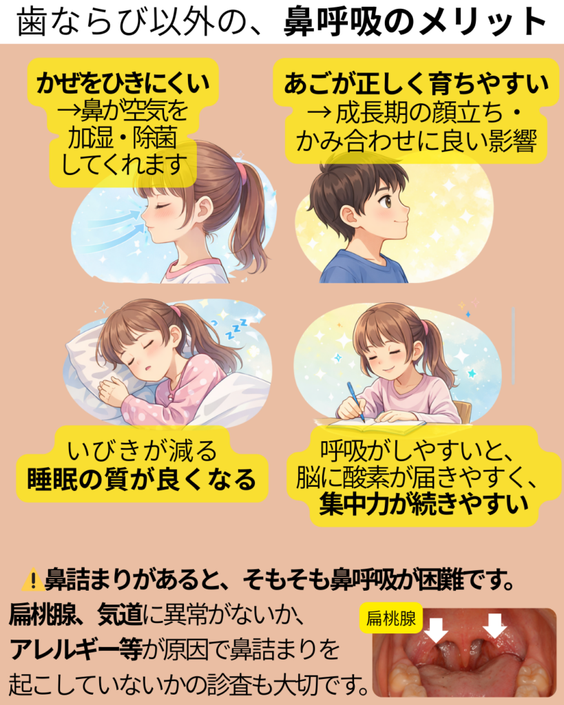 ⚠️ 注意:鼻づまりがあると、そもそも鼻呼吸が困難です。扁桃腺・気道の異常やアレルギーが原因で鼻づまりを起こしていないか、耳鼻科での診査も大切です。当院では必要に応じて耳鼻科へご紹介しています。