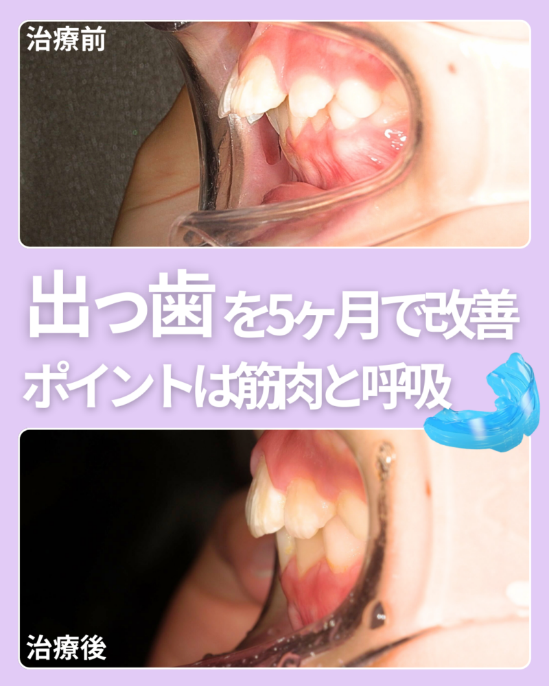 出っ歯の治療前(上)と5ヶ月後(下)の比較。ポイントは筋肉と呼吸のアプローチです。