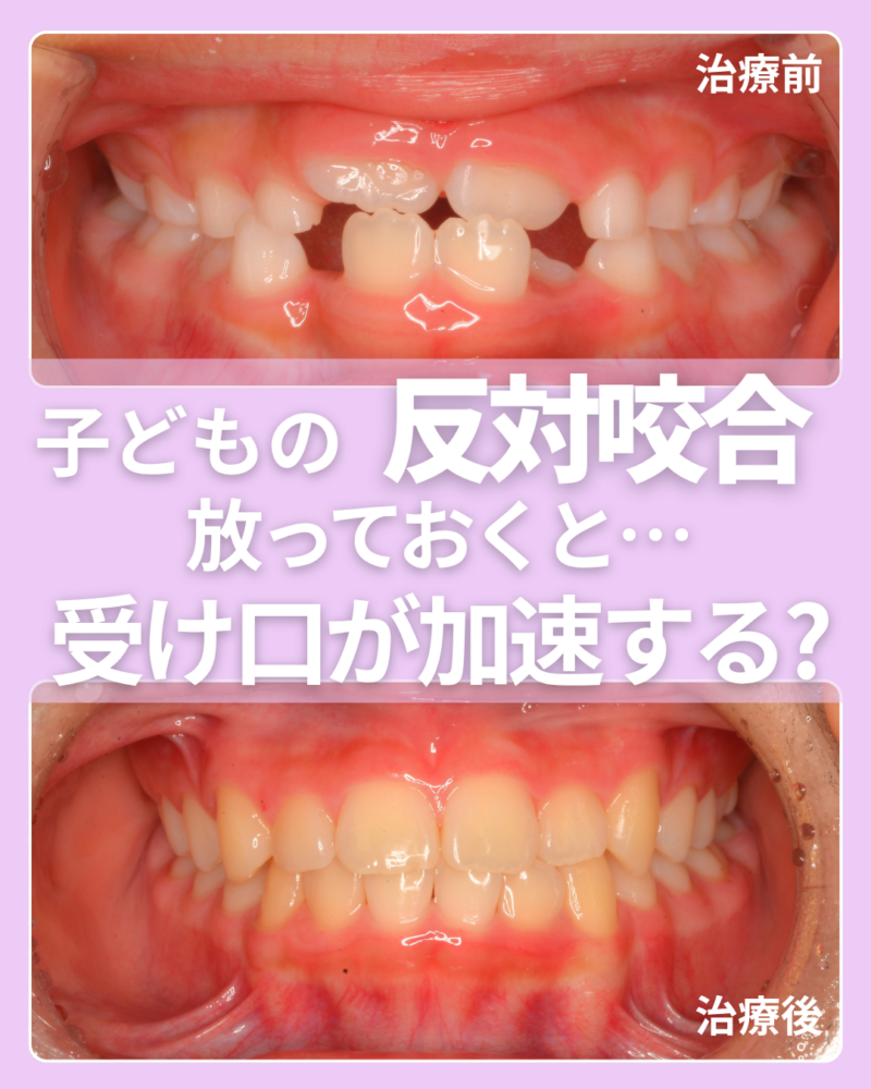 これは例えるなら、成長途中の骨を毎日ぎゅっと押さえつけている状態です。上顎の成長が妨げられるため、反対咬合はどんどん悪化しやすくなります。