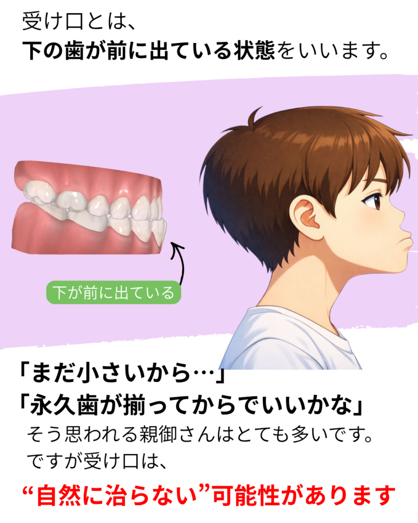 受け口は下の歯が前に出ている状態。「まだ小さいから」と様子を見ていると、自然には治らない可能性があります。