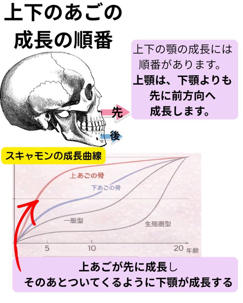 上下の顎の成長には順番があります。上顎が先に前方向へ成長し、その後を追うように下顎が成長します(スキャモンの成長曲線)。