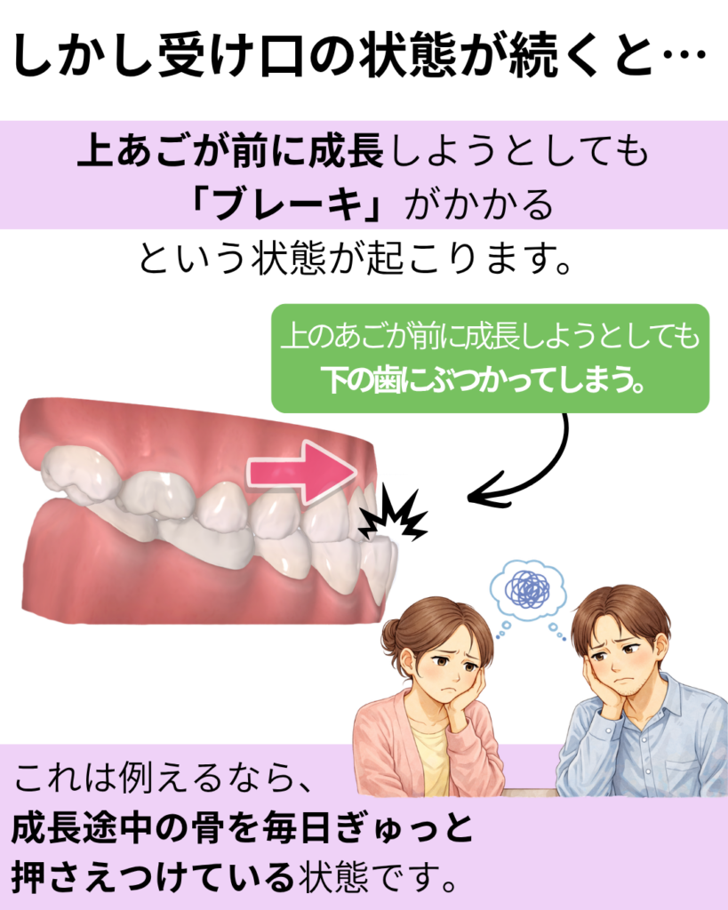 受け口の状態が続くと、上あごが前方向に成長しようとしても、下の歯がブレーキをかけてしまいます。