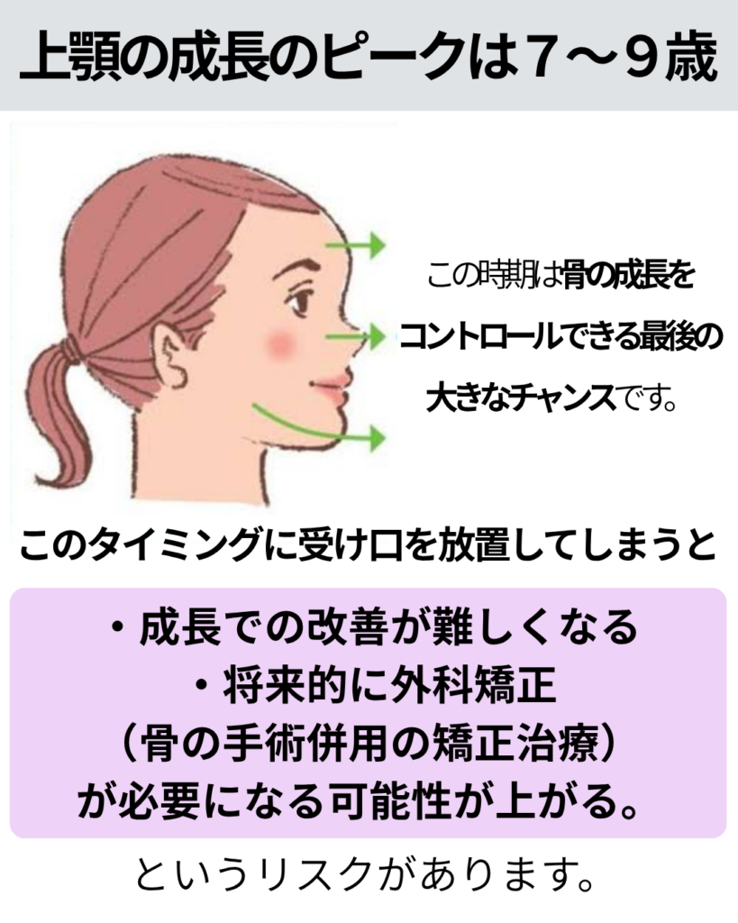 - 上顎の成長ピーク(7〜9歳)を逃さないために