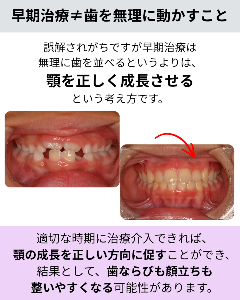 誤解されがちですが、早期治療は無理に歯を並べるというよりは、顎を正しく成長させるという考え方です。