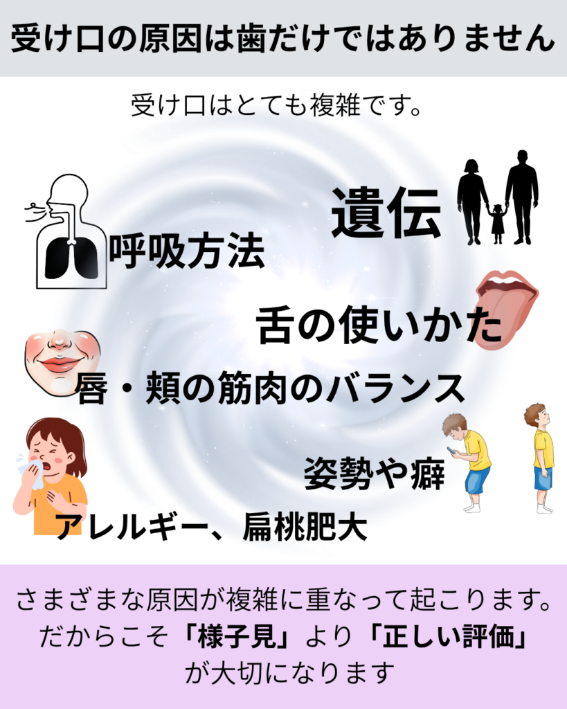 受け口の原因は非常に複雑。遺伝・呼吸・舌の使い方・筋肉・姿勢・アレルギーなど様々な要因が重なって起こります。