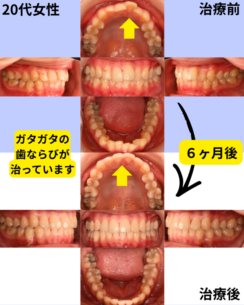 20代女性の治療前と6ヶ月後の口腔内比較(正面・側面・上下)。ガタガタの歯ならびが整っています。