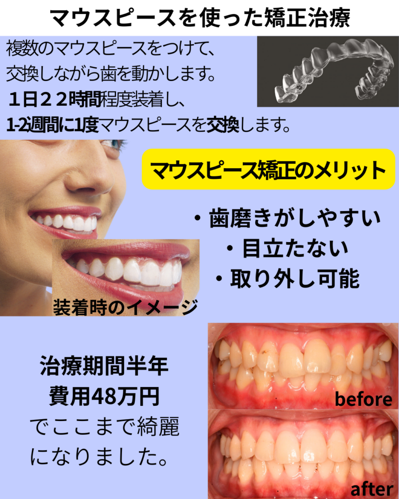 マウスピース矯正は、複数のマウスピースを順番に交換しながら少しずつ歯を動かす治療法です。