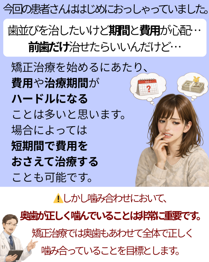 場合によっては短期間・費用を抑えた治療も可能ですが、奥歯の噛み合わせの確認が不可欠です。
