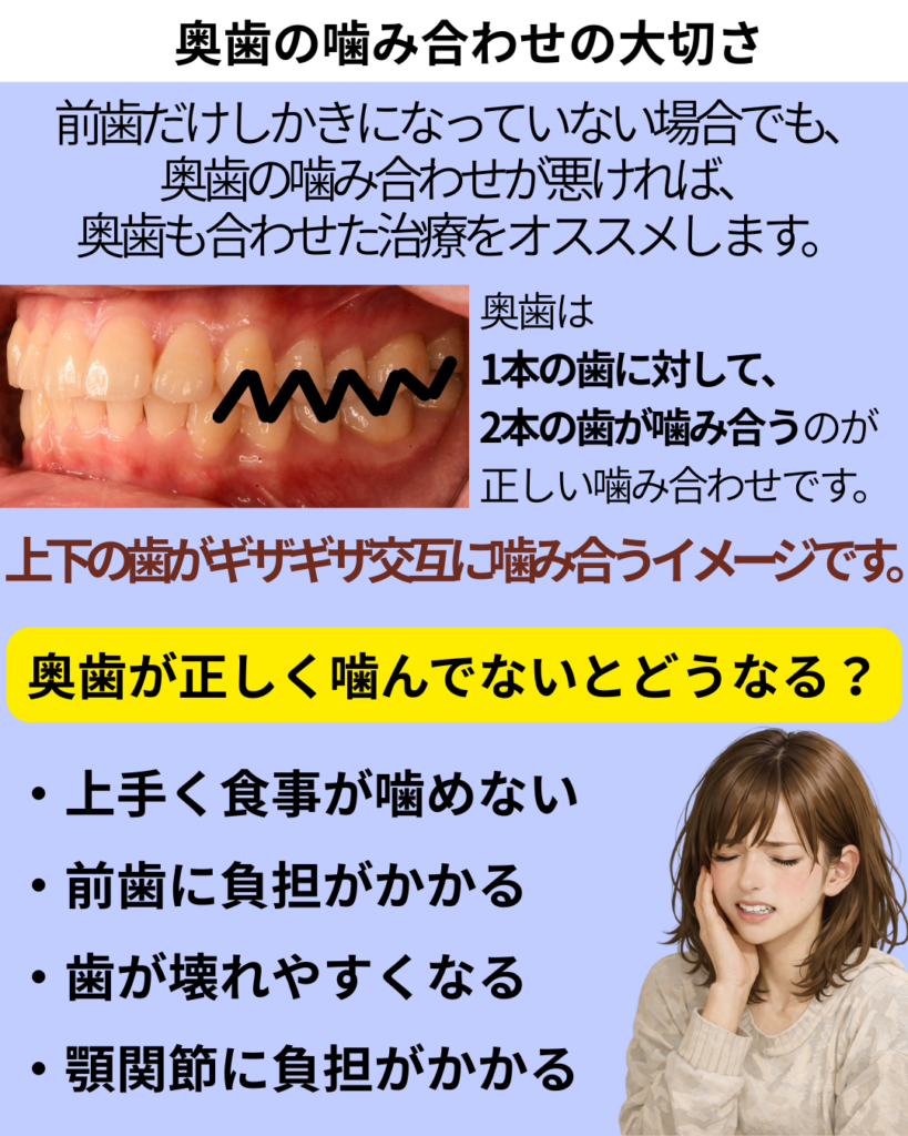 ただし、⚠️ 噛み合わせにおいて、奥歯が正しく噛んでいることは非常に重要です。矯正治療では奥歯もあわせて全体で正しく噛み合っていることを目標とします。
