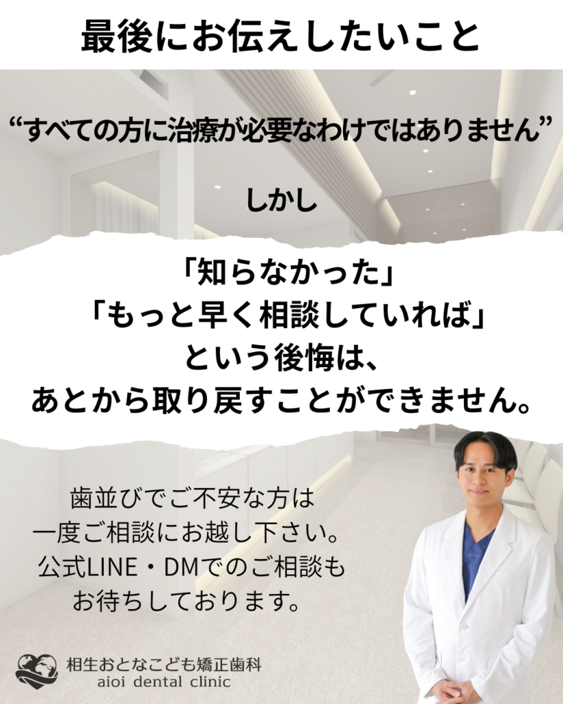「前歯が気になる」「費用と期間を抑えたい」――そんな方もまずはご相談ください。相生おとなこども矯正歯科では、奥歯の噛み合わせを含めた総合的な診断のうえで、本当に必要な治療だけをご提案しています。