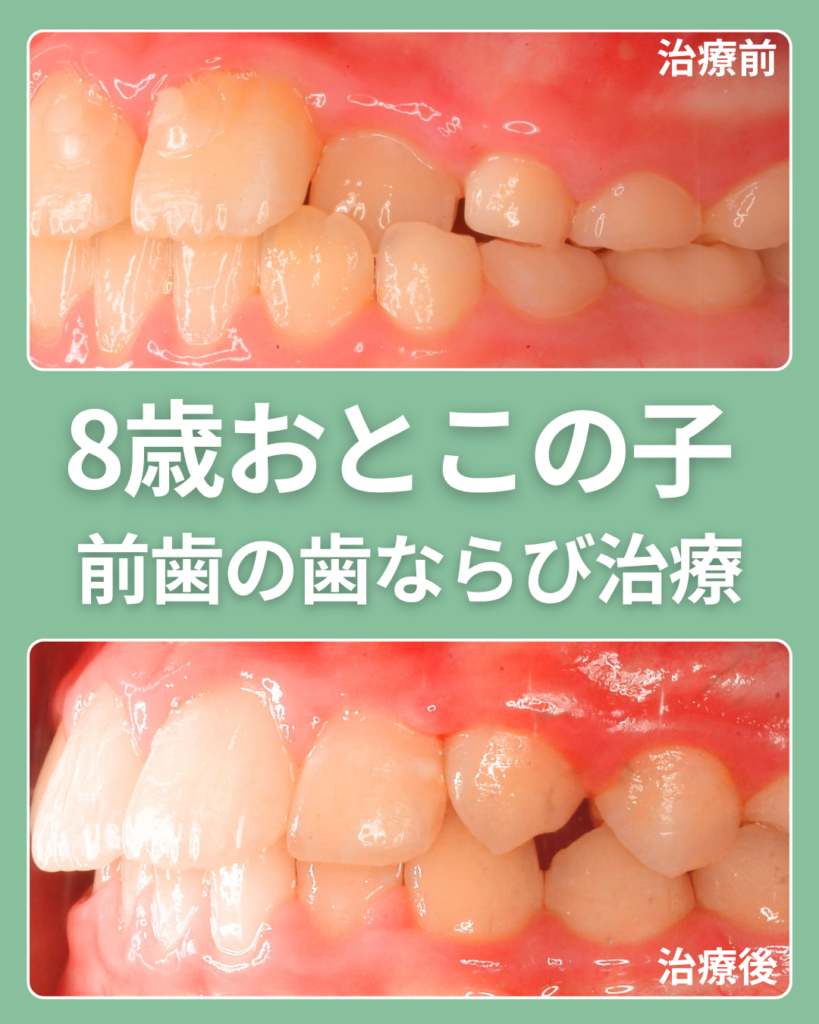 本記事では、8歳男の子の前歯の歯ならび治療を実際の症例・使用装置・治療後の変化とともにわかりやすく解説します。