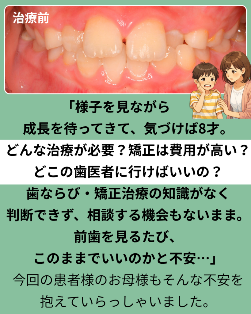 「様子を見ながら成長を待ってきて、気づけば8歳。どんな治療が必要か、矯正は費用が高いのか、どこの歯医者に行けばいいのか――判断できず、相談する機会もないまま不安だけが続いていた」