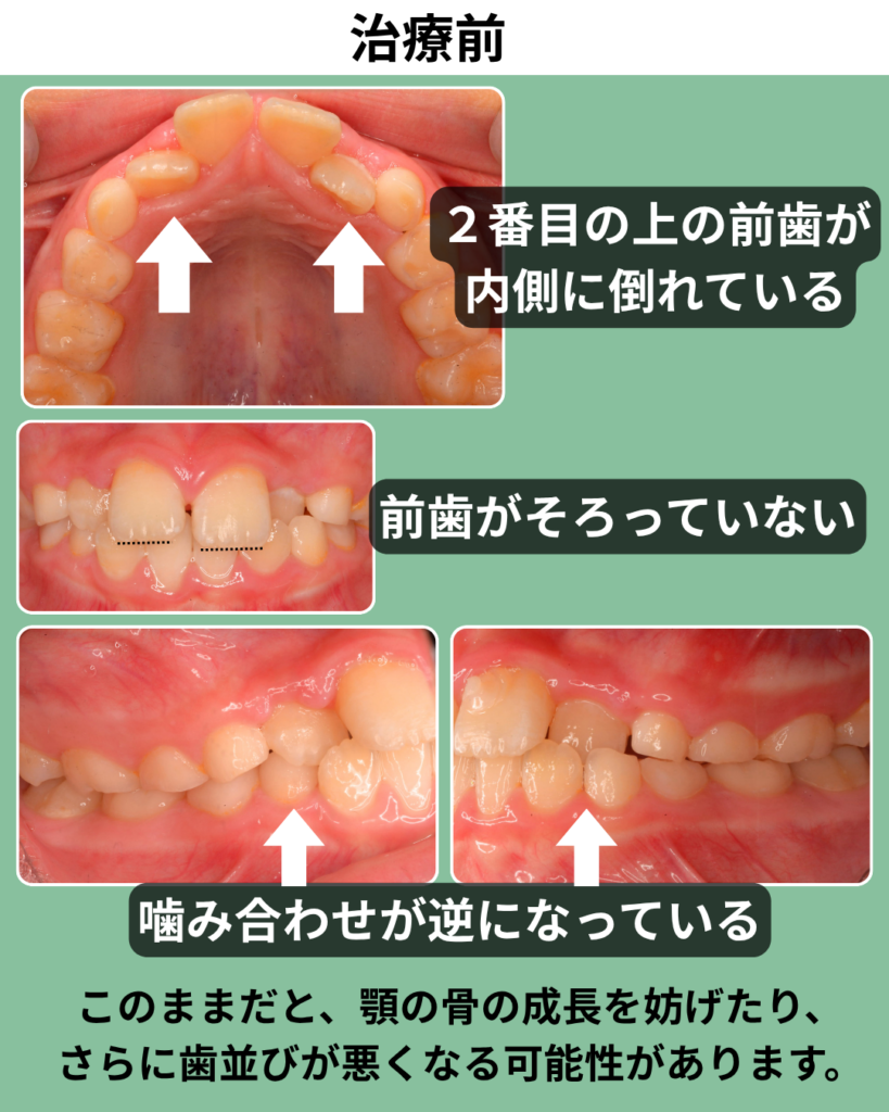 このまま放置すると、顎の骨の成長を妨げたり、さらに歯ならびが悪化する可能性があります。前歯の噛み合わせの問題は、成長期のうちに改善しておくことが重要です。