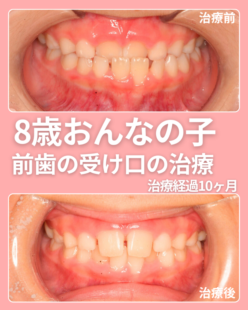 本記事では、8歳女の子の実際の症例をもとに、治療前の診断・マウスピースと舌トレーニングによる治療経過・10ヶ月後の変化をわかりやすく解説します。