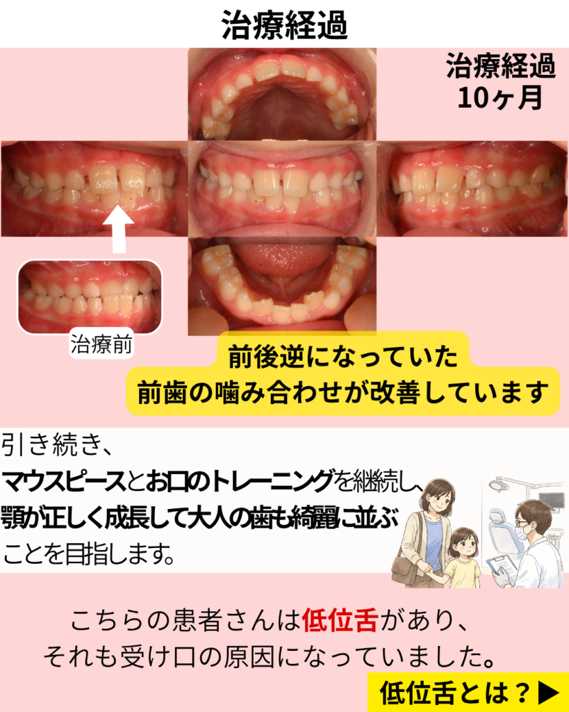 治療10ヶ月後。前後逆になっていた前歯の噛み合わせが改善。引き続きマウスピースと口のトレーニングを継続し、顎の正しい成長を目指します。