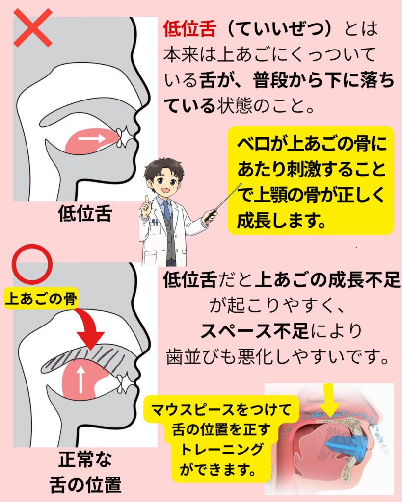 低位舌は舌が上あごに触れず下に落ちている状態。上あごへの刺激が減り、成長不足・スペース不足が起こりやすくなります。