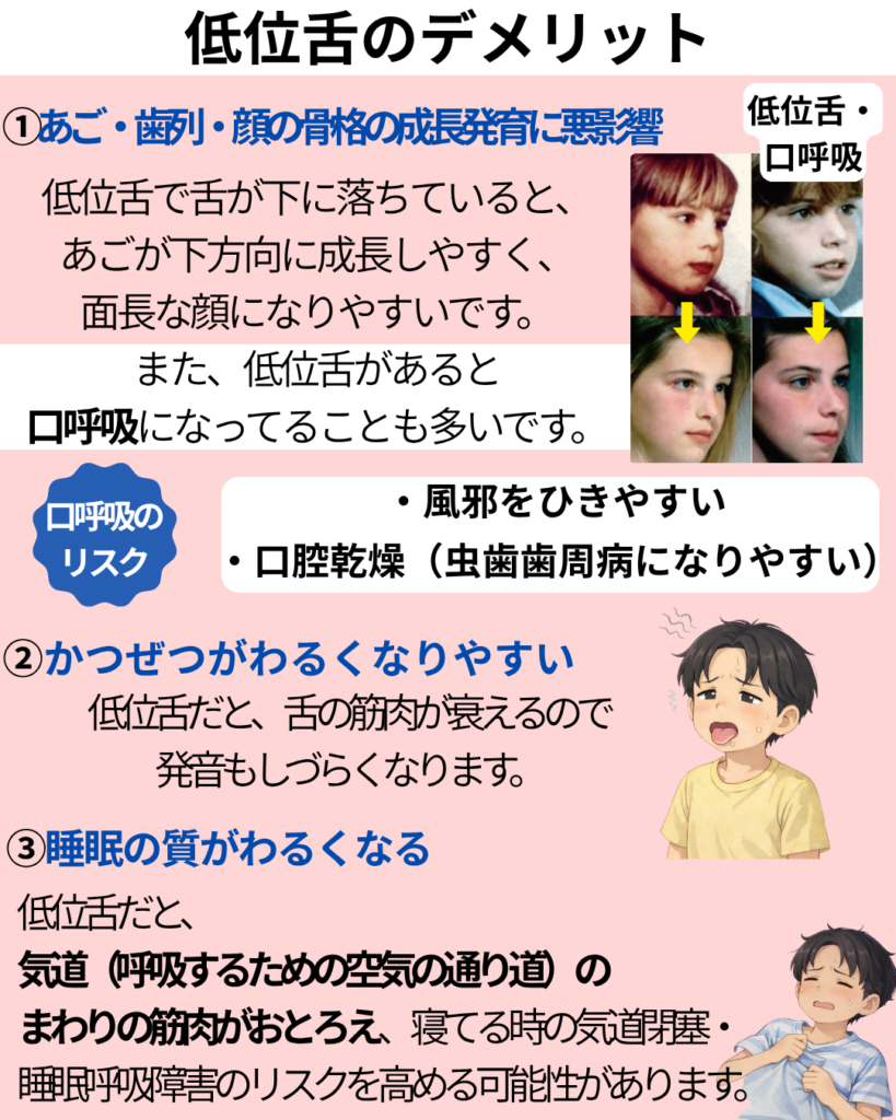 低位舌は歯ならびだけでなく、顔の成長・かつぜつ・睡眠の質にも影響します。