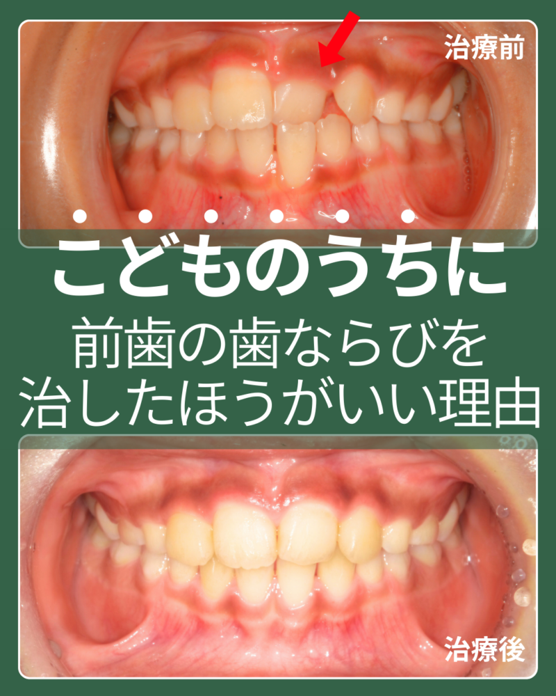 しかし、前歯の噛み合わせの問題は、放置すると上顎の成長や顔立ち・将来の歯の寿命にまで影響することがあります。本記事では、実際の症例をもとに、なぜ子どものうちに前歯の歯ならびを治したほうがよいのかを解説します。