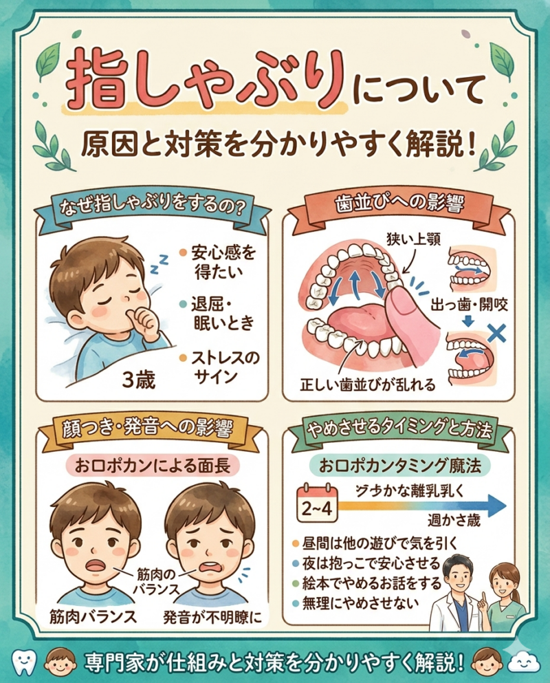 赤ちゃんにとって指しゃぶりは自然な行動であり、心の安定にもつながります。しかし、長く続くと歯並びや噛み合わせに悪影響を及ぼすことが分かっています。