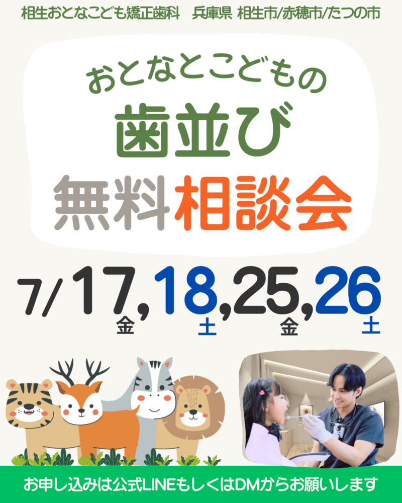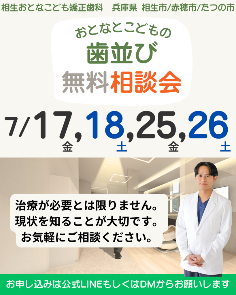 相生おとなこども矯正歯科(兵庫県相生市・赤穂市・たつの市)の歯並び無料相談会。7月17・18・25・26日開催。