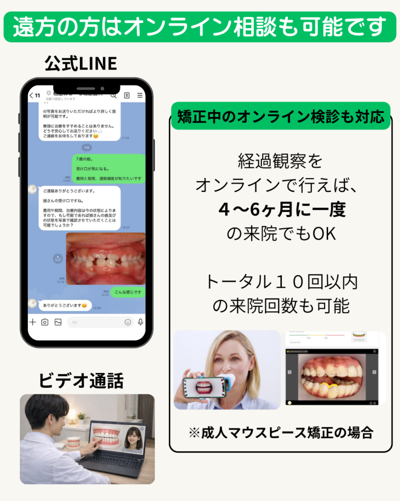 遠方の方は公式LINEまたはビデオ通話でオンライン相談が可能。矯正中のオンライン検診にも対応しています。